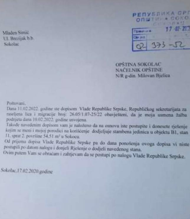 Дана 10. 2. 2022. године Републички секретаријат за расељена лица и миграције запремио је усмену жалбу корисника алтернативног смјештаја Симић Младена на рјешење број: 02-373-52 од 1. 2. 2022. године, а запремљено на дан подјеле кључева у општини Соколац.