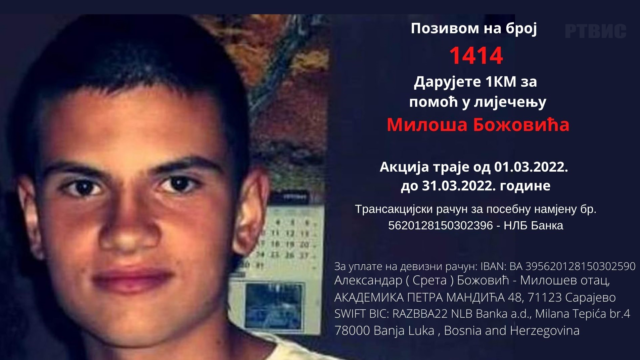 Хуманитарни број 1414 од данас је активан за лијечење нашег суграђанина Милоша Божовића.