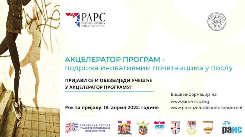 Razvojna agencija Republike Srpske objavila je danas javni poziv za učešće u Akcelerator programu na području grada Istočno Sarajevo namijenjen početnicima u poslovanju čije su poslovne ideje zasnovane na inovaciji, znanju i novim tehnologijama i koje imaju potencijal za rast na tržištu.