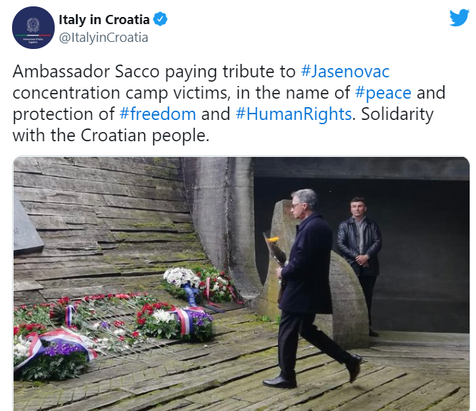 Амбасада Италије објавила је фотографију свог амбасадора у Хрватској који је положио цвијеће на споменик јасеновачким жртвама, а уз фотографију додат је опис у којем се наводи да је амбасадор Пјерфранческо Сако полагањем вијенаца изразио солидарност са “хрватским народом”: “Амбасадор Сако одаје почаст жртвама концентрационог логора Јасеновац, у име мира и заштите слободе и људских права. Солидарност са хрватским народом.”