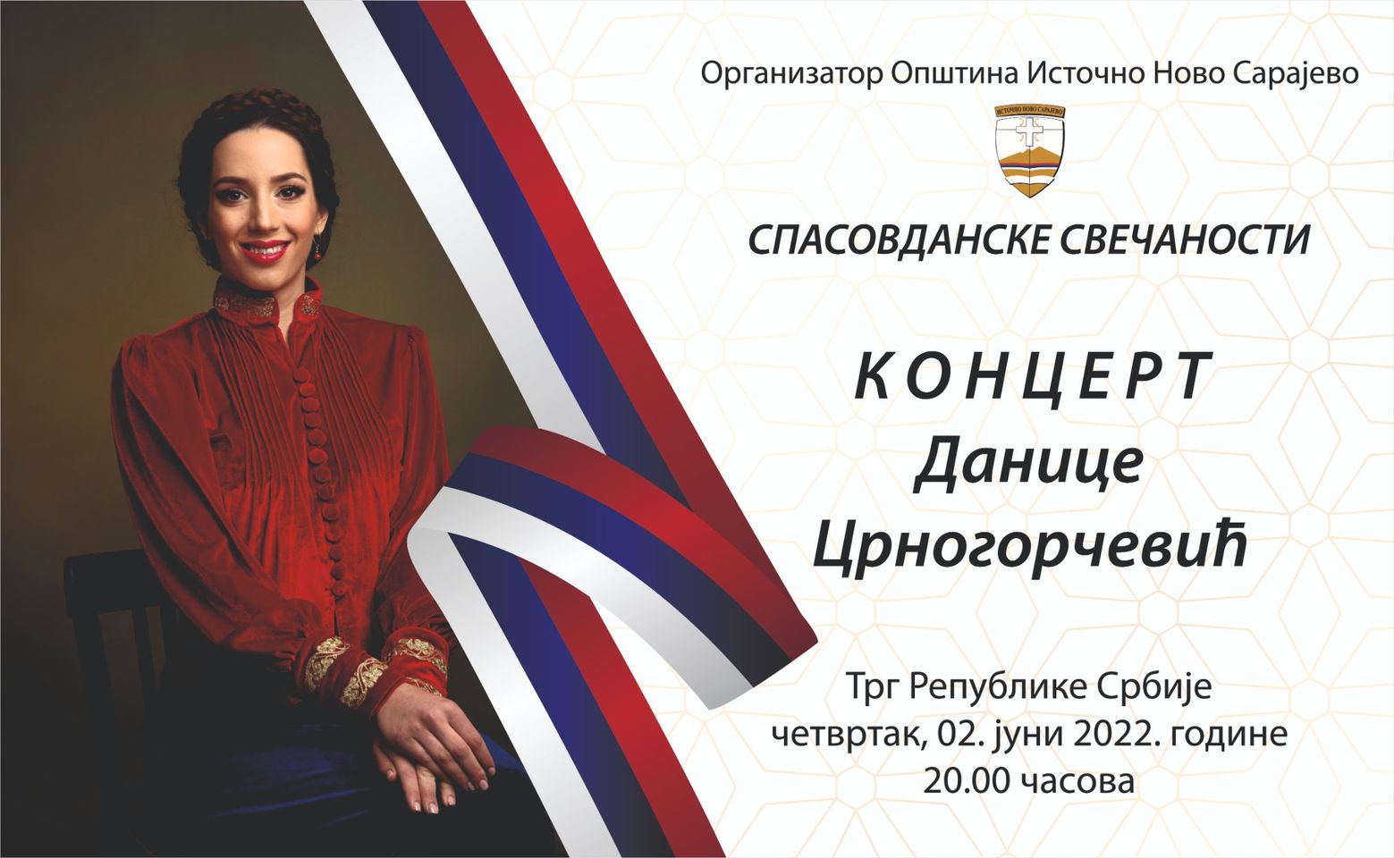 Задовољство нам је најавити концерт једне од најпопуларнијих вокалних солисткиња и интерпретаторки духовне и етно музике из Црне Горе, Данице Црногорчевић, у оквиру овогодишњих Спасовданских свечаности.