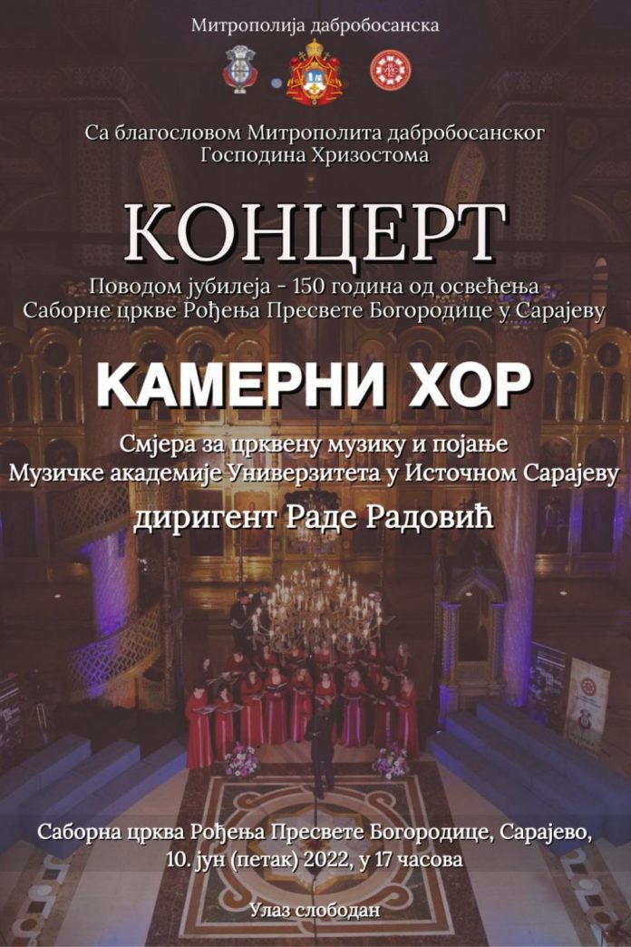 Kamerni hor Smjera za crkvenu muziku i pojanje Muzičke akademije Univerziteta u Istočnom Sarajevu održao je cjelovečernji koncert u Sabornoj crkvi Rođenja Presvete Bogorodice u Sarajevu, koja ove godine proslavlja 150 godina od osveštanja.