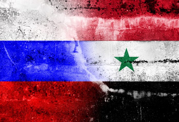 Russia and Syria Flag painted on grunge wall. Vintage and old look.