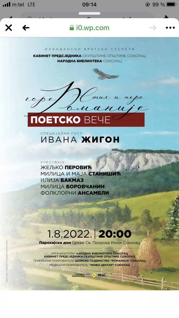 U organizaciji kabineta predsjednika Skupštine opštine Sokolac i Narodne biblioteke Sokolac u ponedeljak prvog avgusta sa početkom u 20.00 časova, održaće se Poetsko veče pod nazivom „Stih i pero gore Romanije“.