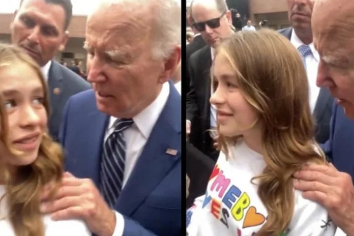 President Joe Biden grabs a young girl by the shoulder and tells her “no serious guys till your 30” as she looks back appearing uncomfortable, secret service appears to try to stop me from filming it after Biden spoke @ Irvine Valley Community College | @TPUSA @FrontlinesShow pic.twitter.com/BemRybWdBI