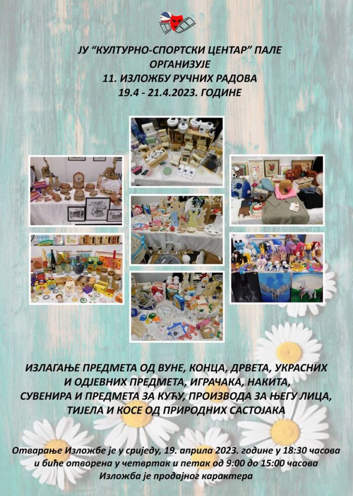 Јавна установа за културу и спорт „Културно- спортски центар“ Пале организује једанаесту по реду, Изложбу ручних радова која ће се одржати у периоду од 19. до 21. априла, у галеријском простору Културног центра.