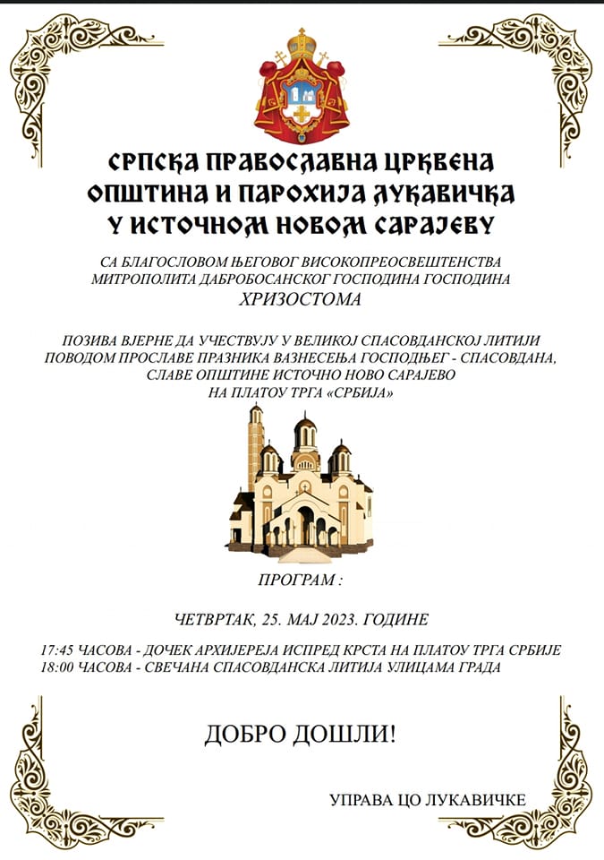 Opština Istočno Novo Sarajevo poziva da se svi zajedno večeras, 25. maja od 17.45 časova okupimo na Trgu Republike Srbije, gdje će Njegovo Visokopreosveštenstvo Mitropolit dabrobosanski gospodin Hrizostom služiti Moleban, nakon čega će Slavska litija proći ulicama naše opštine.