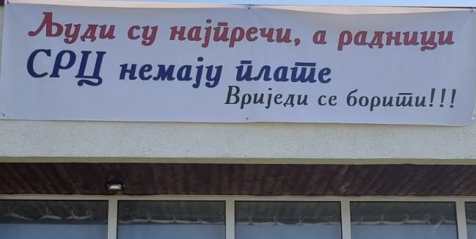 Radnici SRC „Glasinac“ istakli su ovaj transparent da skrenu pažnju na ugroženu egzistenciju svojih porodica i indirektno se obratili načelniku koji slogan ljudi su najpreči vrijedi se boriti koristi svaki put kada opštinu Sokolac zakopa još dublje..