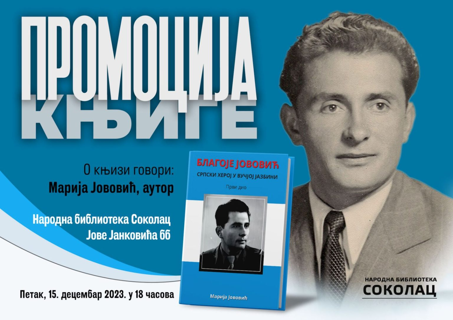 У Народној библиотеци Соколац вечерас у 18.00 часова одржаће се промоција књиге „Благоје Јововић – Српски херој у вучјој јазбини“, ауторке Марије Јововић, која живи и ради у Аргентини, а чији је отац Благоје херој који је пуцао у усташког поглавника Анта Павелића, о чему је ријеч у поменутој књизи.
