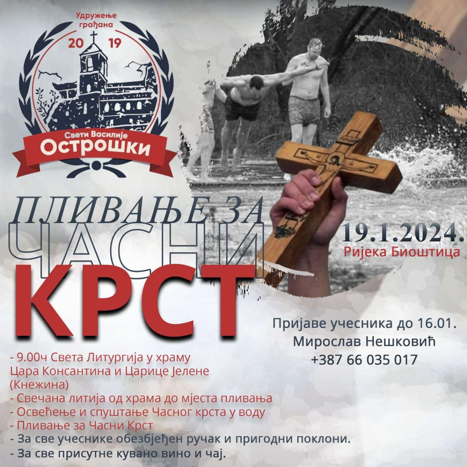 Plivanju će prethoditi liturgija u Manastiru Presvete Bogorodice u Knežini od 9.00 časova i svečana litija od ovog hrama do mjesta na kojem će biti obavljen čin osveštanja vode i spuštanja Časnog krsta u rijeku.