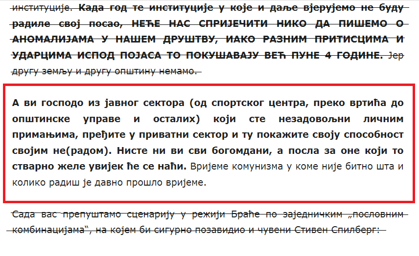„A vi gospodo iz javnog sektora (od sportskog centra, preko vrtića do opštinske uprave i ostalih) koji ste nezadovoljni ličnim primanjima, pređite u privatni sektor i tu pokažite svoju sposobnost svojim ne(radom). Niste ni vi svi bogomdani, a posla za one koji to stvarno žele uvijek će se naći. Vrijeme komunizma u kome nije bitno šta i koliko radiš je davno prošlo vrijeme“, stoji u dijelu objave na sajtu portala Sokolac.