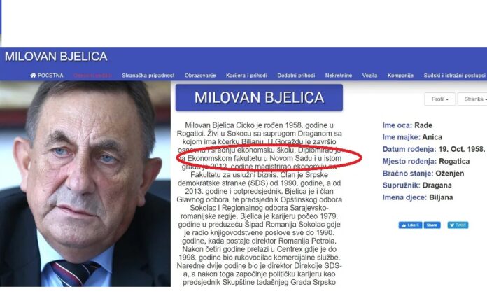 Načelnik Sokoca Milovan Bjelica zvani Cicko nema diplomu Ekonomskog fakulteta u Novom Sadu, kako se tvrdi u njegovoj zvaničnoj biograiji, saznaje Moja Hercegovina.