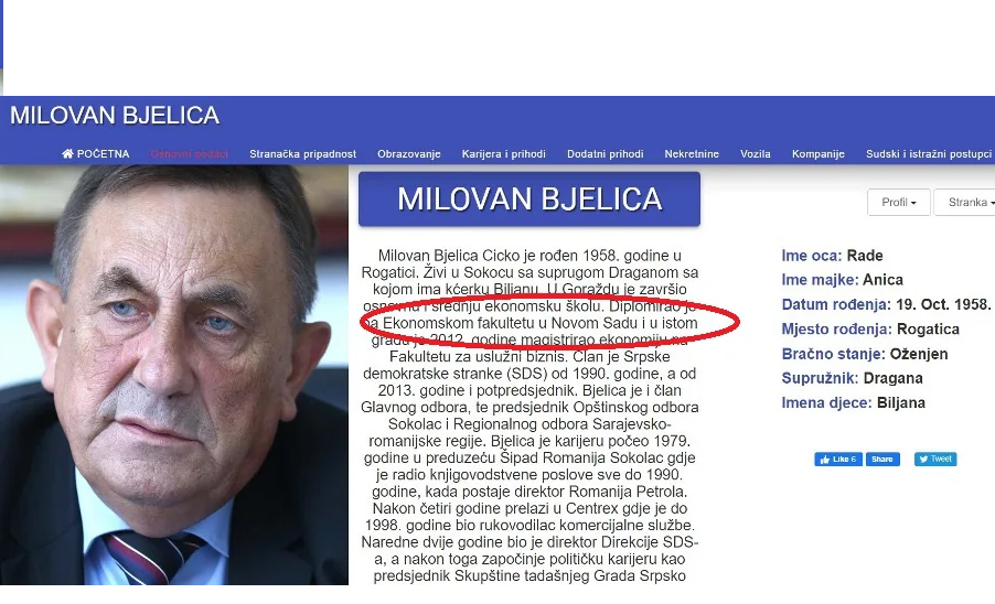 “Milovan Bjelica završio je visoko obrazovanje na Fakultetu za uslužni biznis, Univerziteta ,,Educons” u Novom Sadu sa prosječnom ocjenom 8.11, a diplomirao je sa ocjenom 9”, odgovorili su na kraju iz opštine, iako u zvaničnoj biografiji na stranici opštine Sokolac stoji da je diplomirao sa ocjenom 10, kao što možete da vidite na fotografiji iznad.