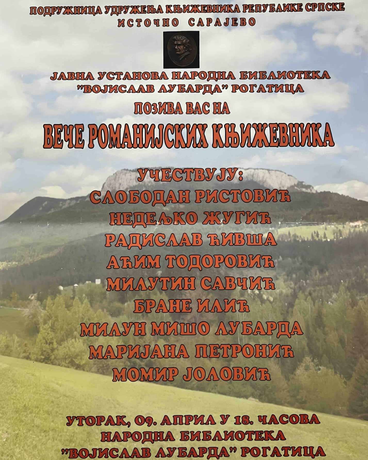 Večeras će u prostorijama Narodne biblioteke u Rogatici sa početkom od 18.00 časova, biti održano književno veče pod nazivom „Veče romanijskih književnika“, a učešće će uzeti knjževnici sa romansijke regije