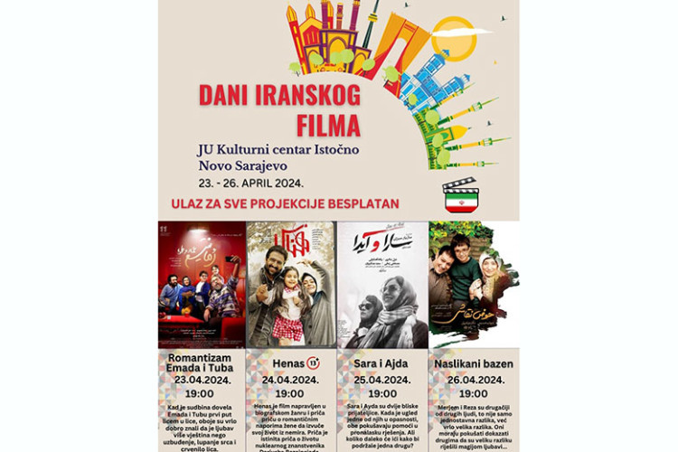 Планирано је да Седмица иранског филма буде отворена сутра у 18.30 часова у Културном центру у Источном Новом Сарајеву, а публика ће моћи да погледа прву филмску пројекцију, филм “Романтизам Емада и Туба”. Планирани су и прикази филмова “Хенас”, “Сара и Ајда”, те “Насликани базен”.