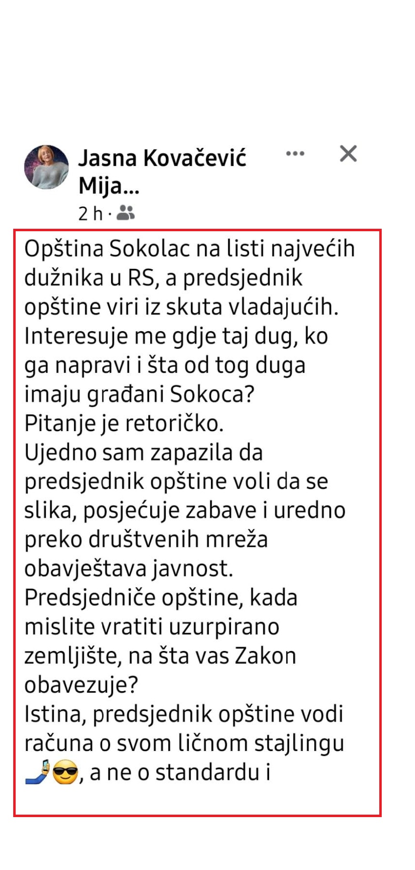 Jedna od takvih poruka je i gospođa Jasna Kovačević koja javno pita još uvijek aktuelnog načelnika Sokoca, kada će početi da radi i postupa po zakonu?