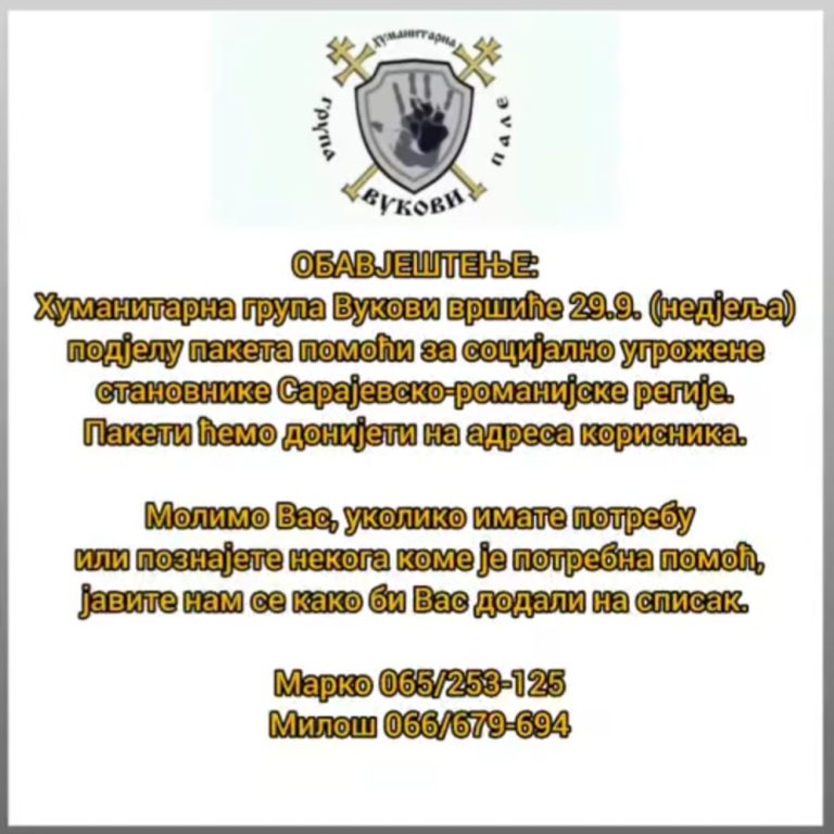 Хуманитарна група Вукови вршиће 29.09. (недјеља) подјелу пакета помоћи за социјално угрожене становнике Сарајевско-романијске регије.