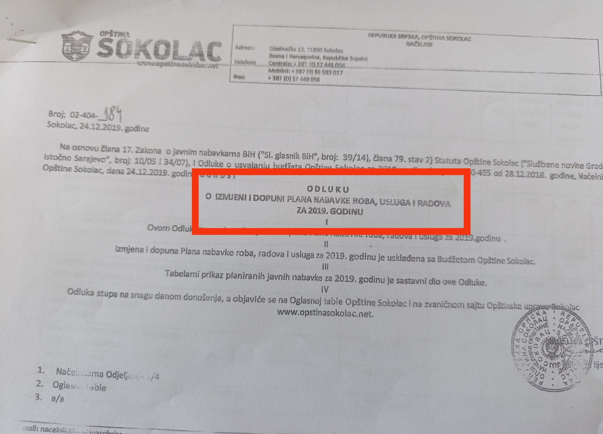 Наш портал дошао је у посјед „Одлуке о измјени и допуни плана набавке роба, услуга и радова за 2019. годину“ у општини Соколац.