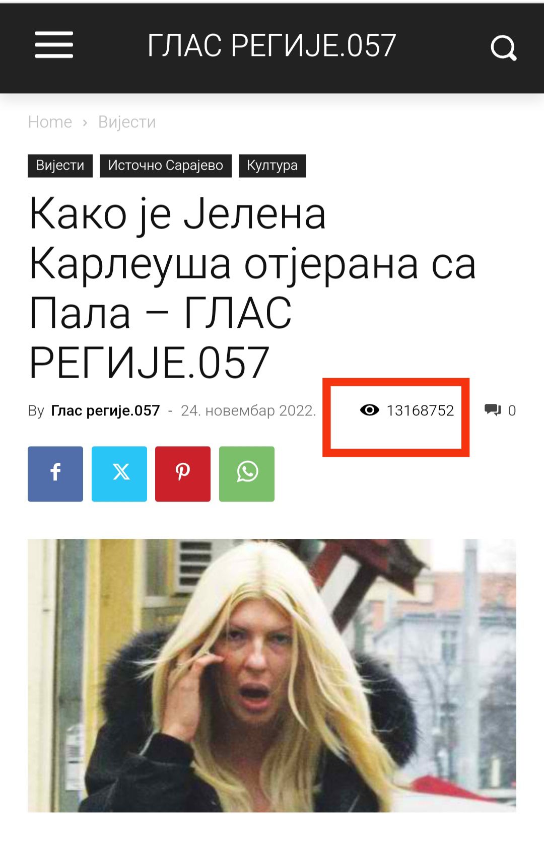 Занимљиву причу под називом “ Како је Јелена Карлеуша отјерана са Пала“, коју смо објавили24.11.2022.године, прегледана је готово 14 милиона пута.