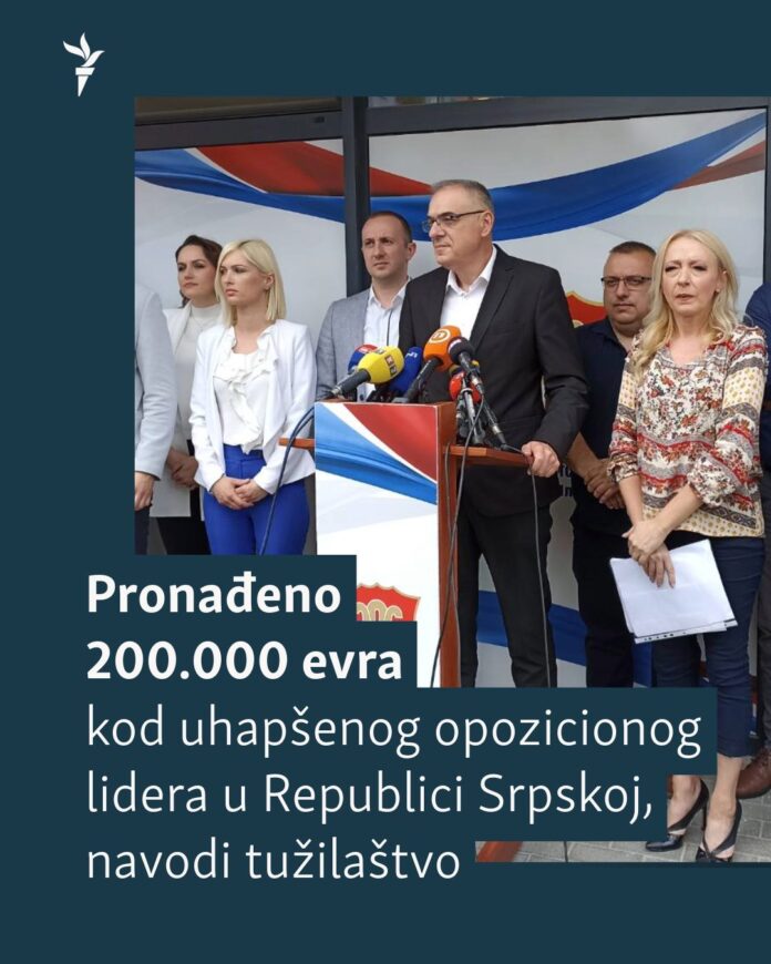 Oko 200.00 evra pronađeno je tokom pretresa kod Milana Miličevića, predsjednika Srpske demokratske stranke (SDS), uhapšenog u ponedjeljak, 9. juna, saopšteno je iz Republičkog javnog tužilaštva Republika Srpska . Iz tog Tužilaštva je saopšteno kako protiv lidera najveće opozicione stranke u Srpskoj  vodi istragu zbog sumnje da je počinio krivično djelo primanje mita, kao i trgovina uticajem. Istragom su obuhvaćeni i Mehmed Dubravac, predsjednik Skupštine Teslića iz Socijaldemokratske partije (SDP), te Meša Jašarević, odbornik Stranke demokratske akcije (SDA) u gradskoj skupštini. Do sada su, tokom pretresa, kod lica M.M. pronađeno je oko 400.000 maraka (oko 200.00 evra), dok je kod lica M.D. pronađeno oko 50.000 maraka (oko 25.000 evra). Pretresi na svim lokacijama još uvijek nisu okončani, te se očekuje da će ukupan iznos pronađenog novca u različitim valutama, kao i drugih relevantnih dokaza, biti poznat po njihovom završetku\“, saopštili su iz Tužilaštva RS. Pristalice SDS-a okupljene ispred kuće Miličevića Prethodno je u ponedjeljak ujutru Ministarstvo unutrašnjih poslova ovog entiteta saopštilou okviru akcije uhapšene osobe iz Teslića, inicijala M.M., M.D. i M.J. Kako saznaje Radio Slobodna Evropa (RSE) ispred kuće lidera SDS-a okupljeni su pristalice i članovi te stranke koji tvrde da se Milan Miličević još nalazi u kući uz prisustvo policije, te najavljuju da neće dozvoliti njegovo odvođenje. Pristalice tvrde da je lider SDS-a Milan Miličević još u kući, te najavljuju da će spriječiti njegovo odvođenje. Iz MUP-a RS i Tužilaštva nisu potvrdili ove navode mještana. U dosadašnjem toku istrage od osumnjičenih lica je, prema navodima MUP-a RS, u više navrata oduzeto ukupno 90.000 maraka (45.000 evra), kao novca koji su, kako se navodi, osumnjičeni dali za kupovinu odbornika Skupštine opštine Teslić, s ciljem vršenja zloupotreba svog izbornog mandata, mijenjanja skupštinske većine i glasanja po nalogu osumnjičenih. Dio novca od oko 90.000 maraka (oko 45.000 evra) za koji MUP RS tvrdi da je pronađen u toku istrage protiv Miličevića. U saopštenju MUP-a RS su objavljene fotografije pronađenog novca, no bez dodatnih informacija na kojoj loklaciji ili kod koga je novac nađen. U saopštenju se dodaje i da Tužilaštvo nastavlja istragu, uključujući pretrese i druge istražne radnje s ciljem pronalaska dokaza za izvršenje ovih koruptivnih djela, kao i novca u iznosu od oko 250.000 maraka (oko 125.000 evra) koji je predat osumnjičenom M.J. koji još nije pronađen. Uprava kriminalističke policije je Republičkom javnom tužilaštvu podnijela Izvještaj o počinjenim krivičnim djelima protiv tri privedene osobe. One će, nakon kriminalističke obrade, biti predate u nadležnost tužilaštva, saopštio je MUP RS. PROČITAJTE I OVO: Predsjednik Srpske demokratske stranke odbacio krivicu za traženje mita Reakcije iz RS Iz Gradskog odbora Srpske demokratske stranke u Tesliću saopštili su da su \“pripadnici MUP-a, po nalogu i pritisku političkih centara moći, izvršili upade u prostorije Gradske uprave Teslić, u porodičnu kuću gradonačelnika Milana Miličevića, kao i u domove još dva odbornika u Skupštini grada\“. \“Riječ je o očiglednom pokušaju političkog zastrašivanja, pravljenju haosa i nasilju nad slobodno izraženom voljom građana. Ovo nije borba protiv kriminala – ovo je gola represija nad neistomišljenicima\“, naveli su iz Gradskog odbora SDS Teslić na Facebooku. Lider Partije demokratskog progresa (PDP), Draško Stanivuković, u objavi na društvenim mrežama, naveo je da \“hapšenje Miličevića nije pravna, nego politička akcija i zloupotreba zakona, prava i institucija\“. \“Svaki režim koji se boji istine i odgovornosti, pribjegava istim metodama: pritisak, zastrašivanje, montirane optužnice… Obruč se steže oko njih, a oni ga pokušavaju prenijeti na opoziciju\“, naveo je Stanivuković. Dodao je da Miličeviću pruža \“punu i nedvosmislenu podršku\“, te da \“u zemlji u kojoj kriminal i korupcija vladaju kao glavni zakoni, ljudi koji se bore protiv toga ne smiju biti mete\“. Srpska demokratska stranka ima 11 od ukupno 83 poslanika u Narodnoj Skupštini Republike Srpske. U državnoj Parlamentarnoj skupštini Bosne i Hercegovine ima dva poslanika u Zastupničkom i jednog delegata u Domu naroda. Nebojša Vukanović, predsjednik opozicionog Pokreta za pravdu i red, za Radio Slobodna Evropa kaže da još ne zna zbog čega je Miličević uhapšen i da ne bi nikoga unaprijed da brani. Ipak, mišljenja je da \“pravosuđe postoji samo za za opoziciju, dok je vlast amnestirana\“. \“Ovo predstavlja još jedan korak dalje u progonu i obračunu sa opozicijom. Nakon odluke da nam se zabrani finansiranje i jednostavno ne postoje nikakvi uslovi za bilo kakav otpor mafiji i režimu. Oni hoće da jednostavno zavedu apsolutnu diktaturu zloupotrebljavajući zarobljene institucije.\“ PROČITAJTE I OVO: Novi zakon u RS ostavio opoziciju bez novca, a BiH bez nadležnosti Ovo je najnoviji problem za opoziciju u RS, obzirom da je 21. maja u entitetskom parlamentu usvojen zakon o finansiranju političkih stranaka, kojim se ukida finansiranje političkih partija iz entitetskog i lokalnih budžeta. Koalicija opozicionih stranaka u RS, predvođena SDS-om, 9. maja je potpisala platformu o saradnji sa strankama \“Trojke\“ iz Federacije BiH, čiji je cilj kako su tada naveli da odblokiraju državne institucije i evropski put zemlje. Ipak, da bi preuzeli većinu u oba doma Parlamentarne skupštine BiH, i izbacili Dodikov SNSD iz vlasti, nedostaje im nekoliko glasova.