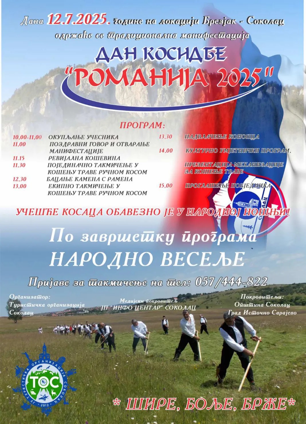 Manifestacija „Dan kosidbe – Romanija 2025“ biće održana sutra, 12. jula na području opštine Sokolac u mjestu Brezjak. uz učešće kosaca iz regiona, najavili su iz sokolačke Turističke organizacije, koja je organizator.