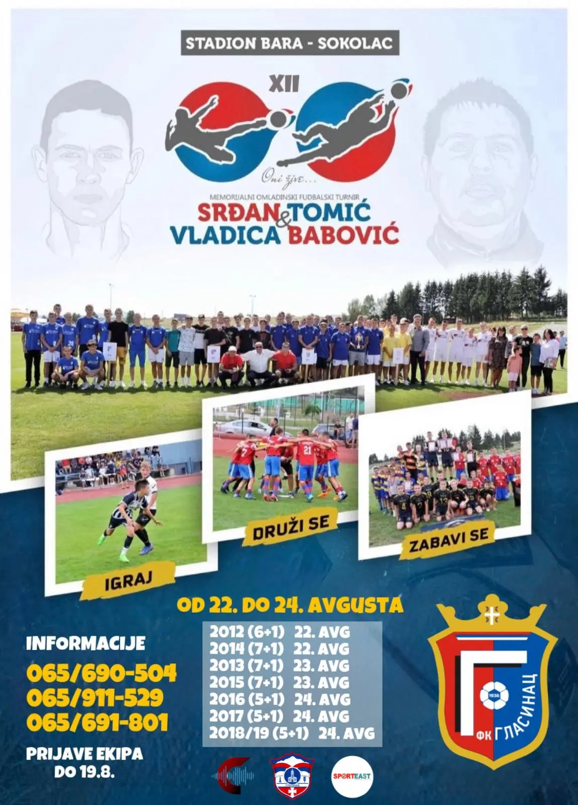 Дванаести Меморијални омладински фудбалски турнир „Срђан Томић & Владица Бабовић“ одржаће се од 22. до 24. августа на стадиону „Бара“ у Сокоцу.