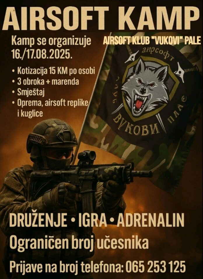Airsoft klub “Vukovi” iz Pala organizuje dvodnevni Airsoft kamp 16. i 17. avgusta 2025. godine, namijenjen svim ljubiteljima adrenalinskih igara, vojne taktike i druženja u prirodi.