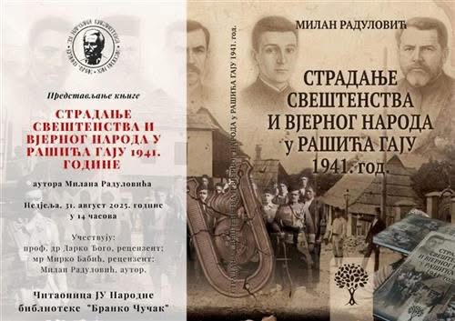 Промоција књиге „Страдање свештенства и вјерног народа у Рашића Гају 1941. године“ у Народној библитеци „Бранко Чучак“ почеће у 14.00 часова, а потом истог дана у амфитеатру Средњошколског центра „Милутин Миланковић“ у Милићима од 17.30 часова.