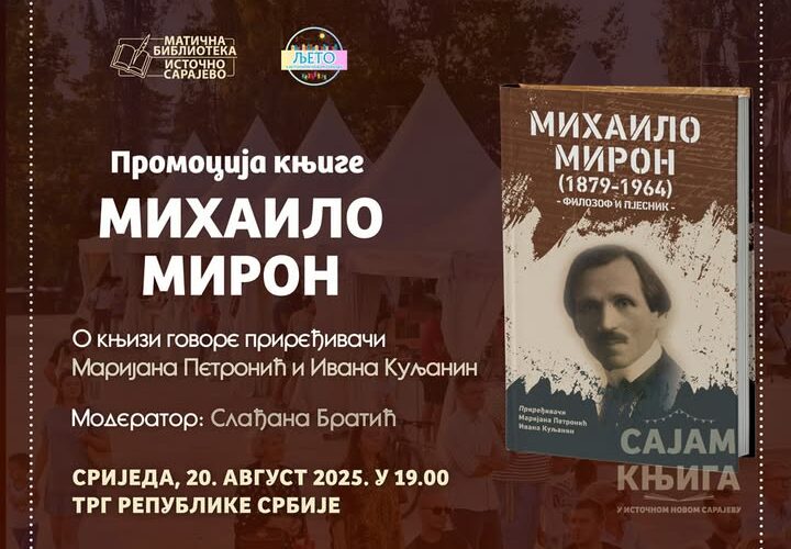 У сриједу, 20. августа, трећег дана Сајма књига, на Тргу Србија са почетком у 19.00 часова, биће одржана промоција књиге „Михаило Мирон: филозоф и пјесник“.