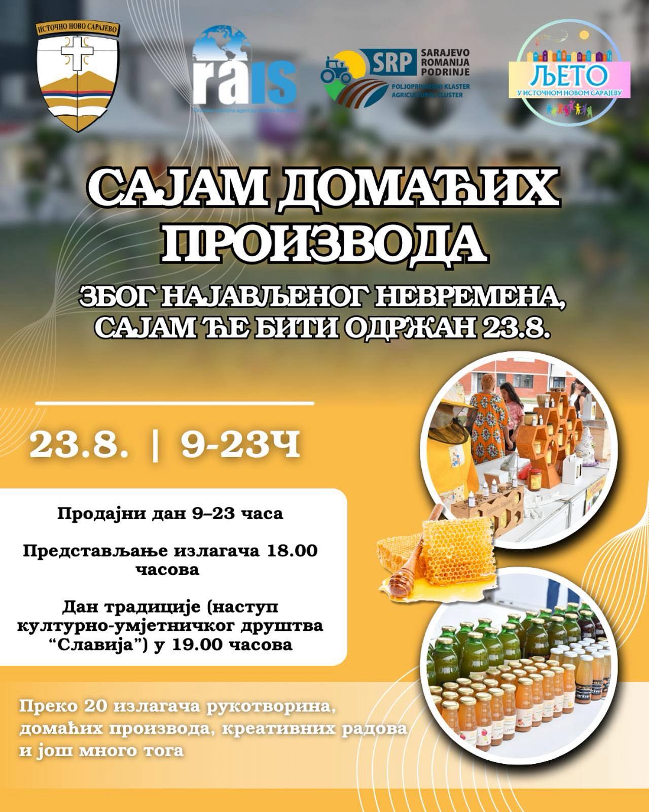 Zbog najavljenih loših vremenskih prilika, izmijenjen je program Sajma zdrave hrane, domaćih i unikatnih proizvoda i rukotvorina u Istočnom Novom Sarajevu, pa će svi sadržaji biti održani sutra.