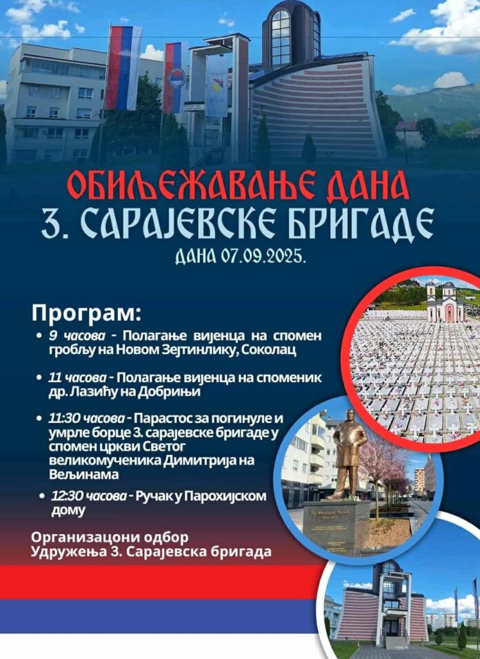 Удружење 3. Сарајевска бригада организује обиљежавање Дана бригаде 7. септембра 2025. године. Програм обухвата полагање вијенаца на спомен-гробљу у Сокоцу и на споменик др. Лазићу на Добрињи, парастос у храму Светог великомученика Димитрија на Вељинама, те заједнички ручак у Парохијском дому.