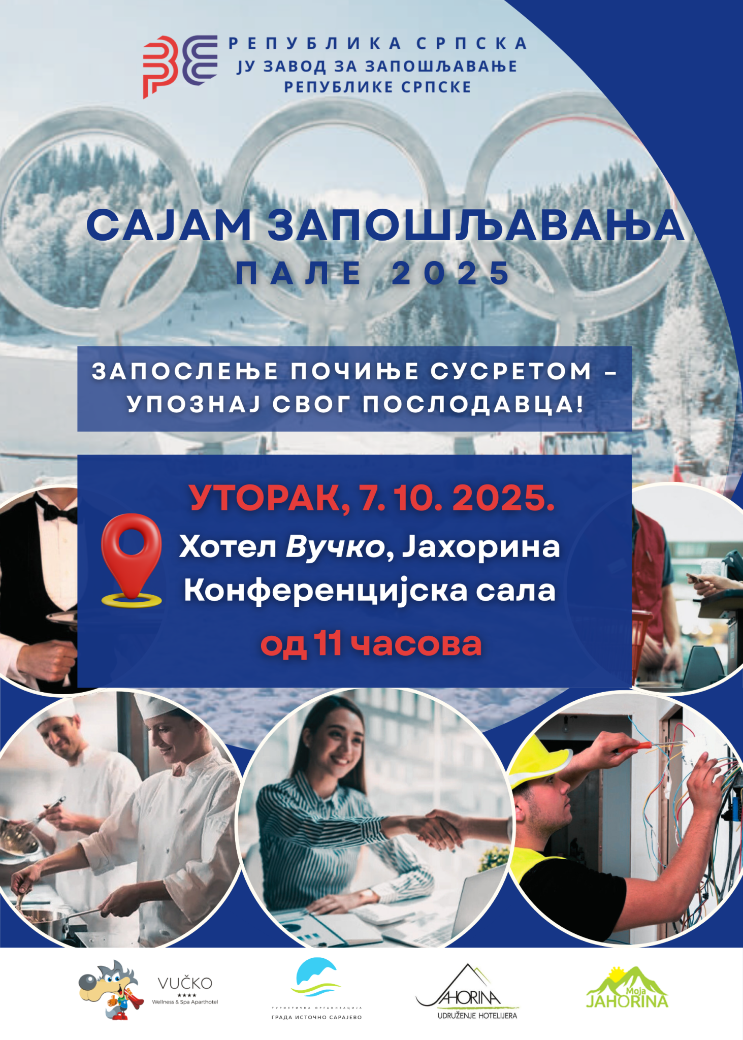 ЈУ Завод за запошљавање Републике Српске најављује Сајам запошљавања Пале 2025, који ће бити одржан у уторак, 7. октобра, са почетком од 11 часова у хотелу „Вучкоˮ на Јахорини.