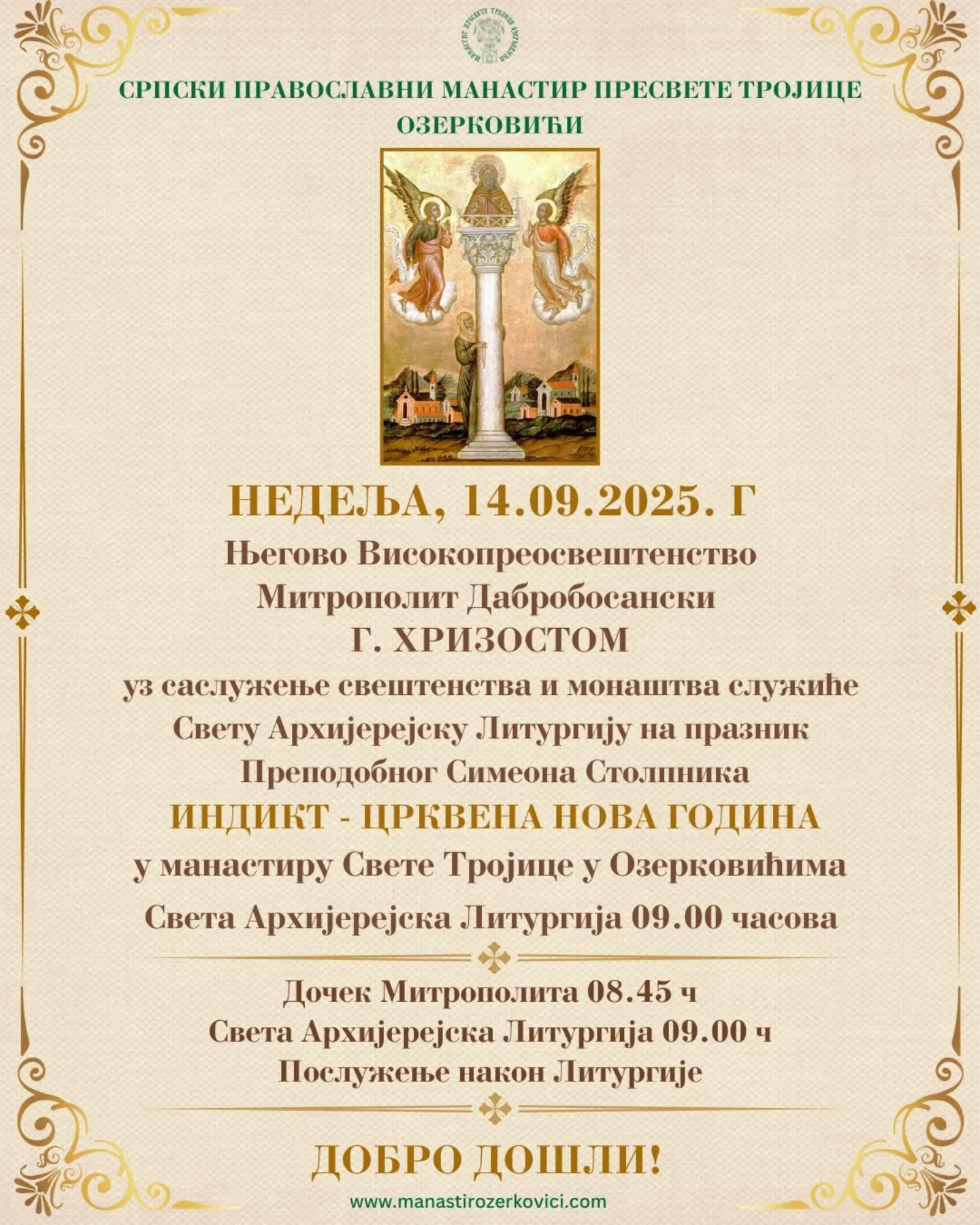 На празник Преподобног Симеона Столпника, у недјељу, 14.септембра, његово високопреосвештенство митрополит дабробосански господин Хризостом служиће Свету Архијерејску Литургију у манастиру Свете Тројице у Озерковићима.