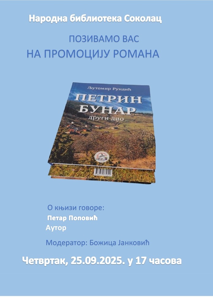 Народна библиотека Соколац организује промоцију другог дијела књиге „Петрин бунар“, аутора Љутомира Рундића. О књизи ће говорити аутор и Петар Поповић.