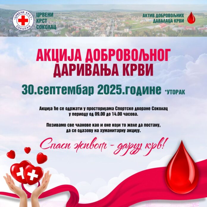 Актив добровољних давалаца крви који дјелује у оквиру општинског Црвеног крста „Соколац“ , 30. септембра организује акцију добровољног даривања крви.