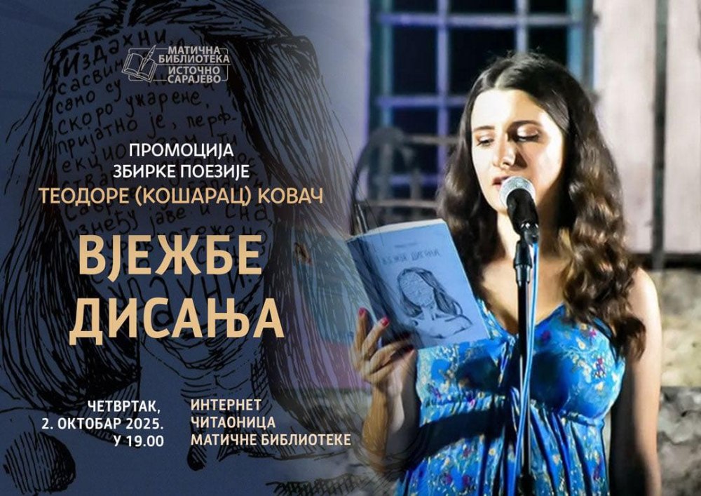 Matična biblioteka Istočno Sarajevo u četvrtak, 2. oktobra, organizuje promociju zbirke poezije „Vježbe disanja“ autorke Teodore Kovač.