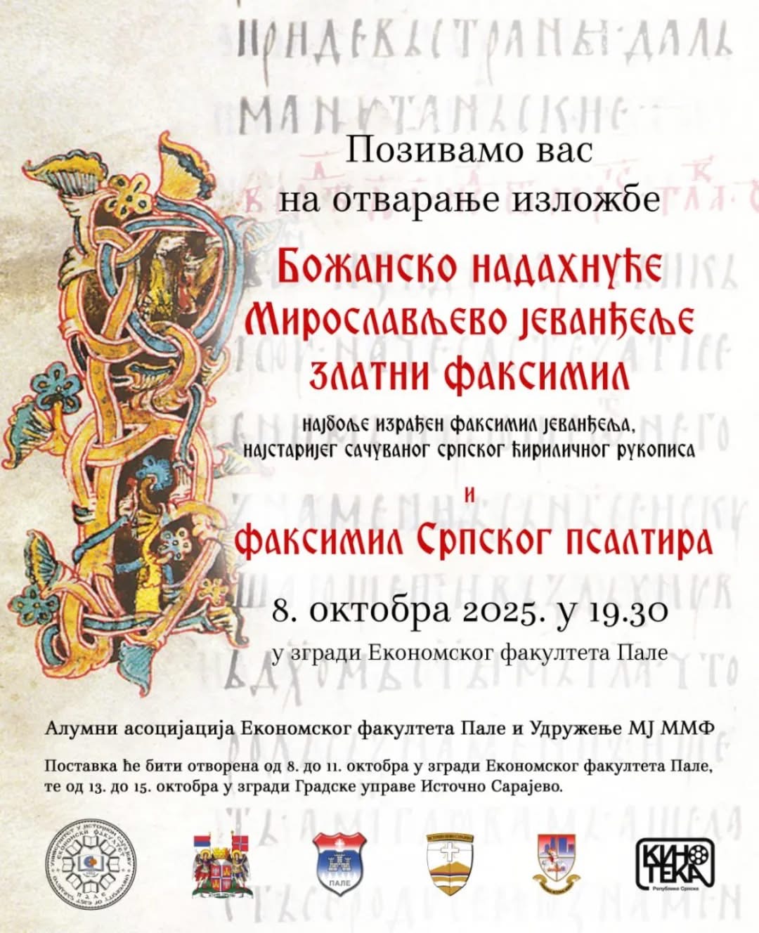 Izložba pod nazivom „Božansko nadahnuće – Miroslavljevo jevanđelje“, najbolje izrađenog faksimila jevanđelja, najstarijeg sačuvanog srpskog ćiriličnog rukopisa, koje se smatra najvrednijim srpskim pokretnim kulturnim dobrom, biće otvorena u srijedu, 8. oktobra od 19.30 časova u prostorijama Ekonomskog fakulteta Univerziteta u Istočnom Sarajevu.