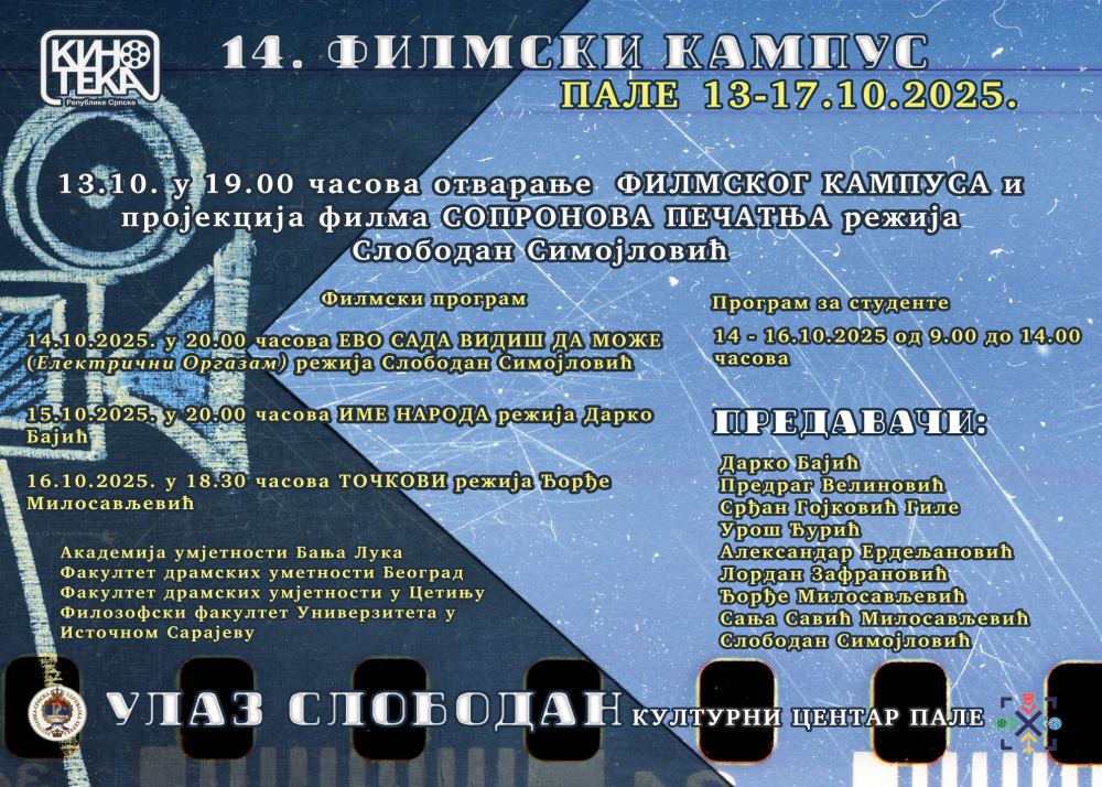 Kinoteka Republike Srpske organizuje 14. po redu Filmski kampus- program za studente od 13. do 17. oktobra u Palama.