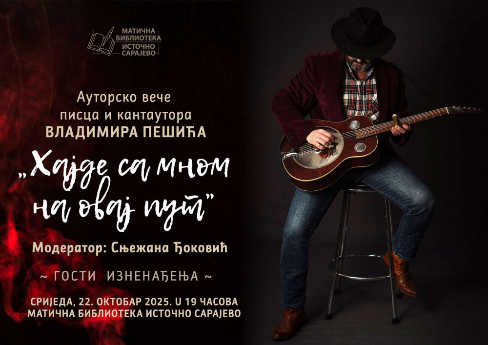 Književno-poetsko veče posvećeno stvaralaštvu Vladimira Pešića, pjesnika, pisca i kantautora, biće održano u srijedu, 22. oktobra, u 19.00 časova u Matičnoj biblioteci Istočno Sarajevo.