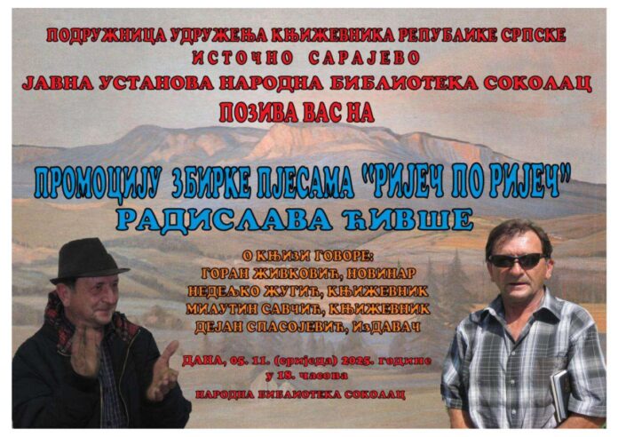 Подружница Удружења књижевника Републике Српске – Источно Сарајево и Јавна установа Народна библиотека Соколац организују промоцију збирке пјесама „Ријеч по ријеч“ аутора Радислава Ћивше.