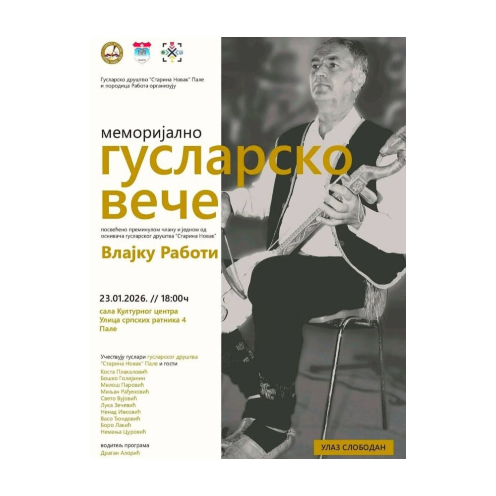 Гусларско друштво „Старина Новак“ са Пала и породица Работа организују Меморијално гусларско вече посвећено преминулом члану и једном од оснивача овог гусларског друштва Влајку Работи.