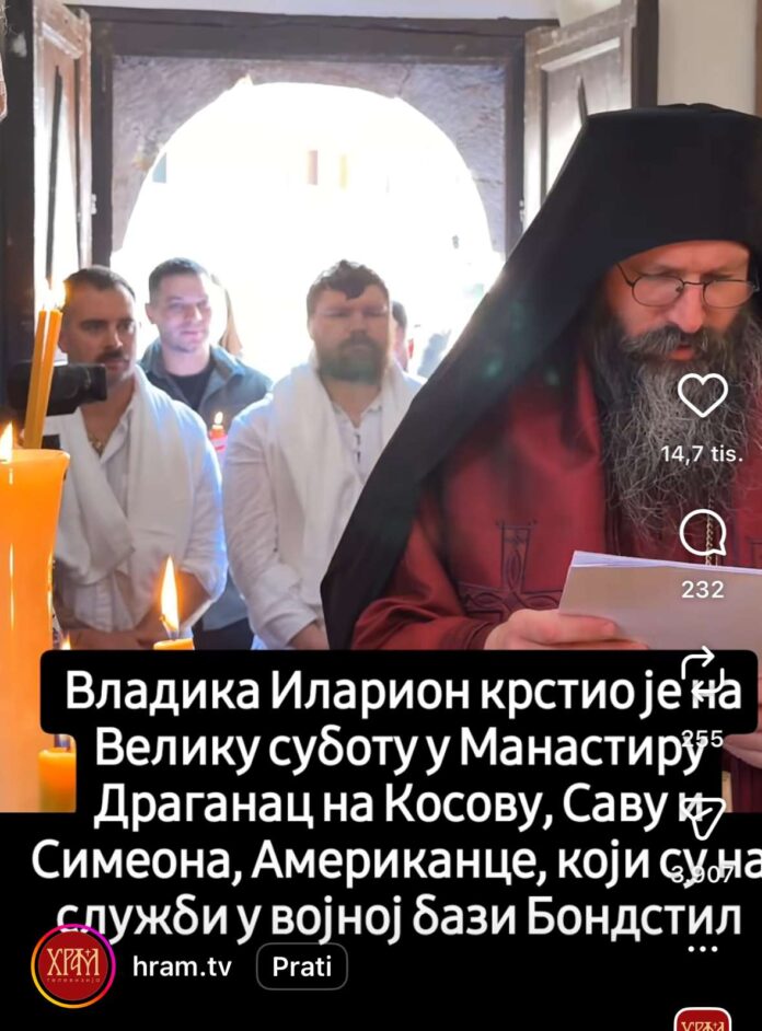 Двојица америчких војника Кфора крштена су на Велику суботу на Косову и Метохији, у манастиру Драганац, где их је крстио владика Иларион. Служба је одржана на енглеском језику.